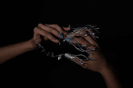 This piece bridges the physical gap between worlds, after the passing of the artist’s grandmother. Away in New York, unable to grieve, this piece links the artist and the grandmother’s hand in a profound symbol of eternal connection, closure, and the enduring presence of a cherished soul.