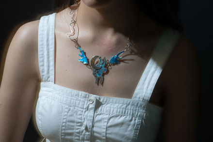 In this piece, I pay homage to my grandmother, envisioning her as both a butterfly and an angel, ever watchful over me. Using transparent enamel, I predominantly employ shades of blue to evoke the essence of water and the night sky. These hues reflect the moments when she feels closest, appearing to me as a star twinkling in the darkness.